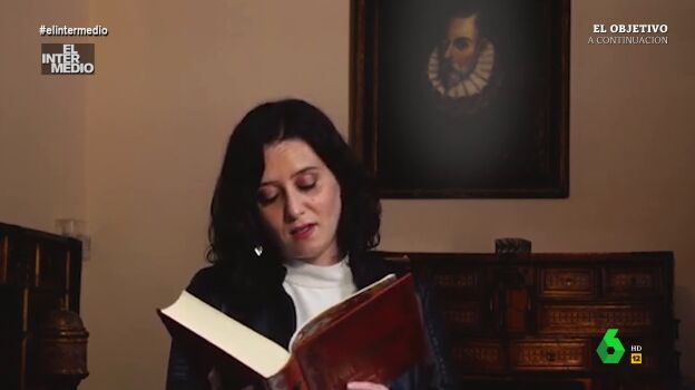 En este montaje de El Intermedio, Isabel Díaz Ayuso lee un pasaje del Quijote ante un retrato de Cervantes que, tras unos segundos escuchando a la presidenta de la Comunidad de Madrid, termina cobrando vida. Su divertida reacción, en este vídeo.
