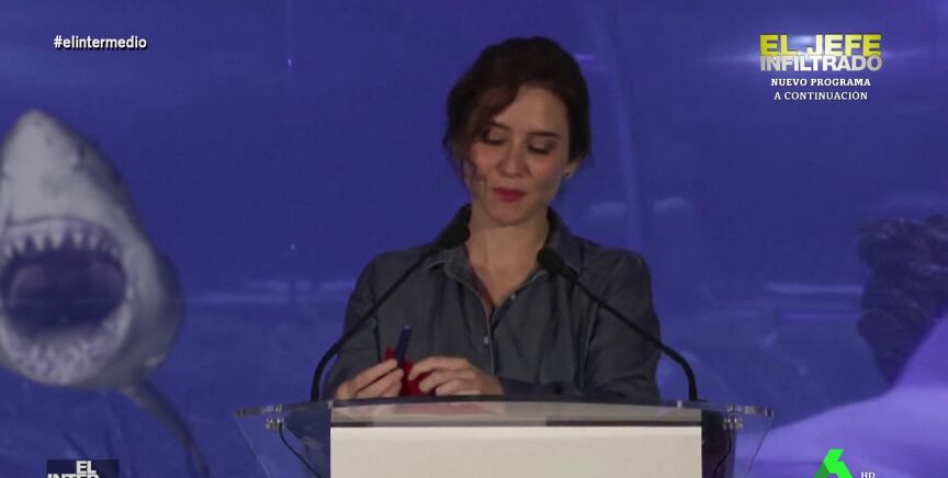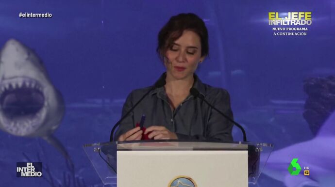 En este montaje de El Intermedio se puede ver cómo Isabel Díaz Ayuso está realizando una intervención ante los medios de comunicación cuando, de repente, un tiburón aparece detrás de ella.