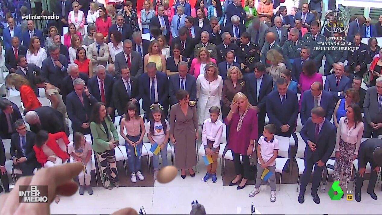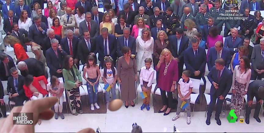 En este montaje de El Intermedio, Isabel Díaz Ayuso saluda a los presentes en un acto de la Comunidad de Madrid cuando, al llegar a su sitio, le tiran un huevo justo delante de ella.