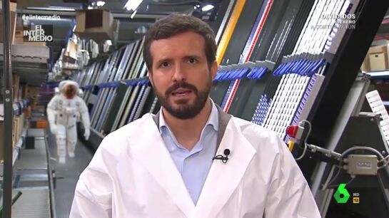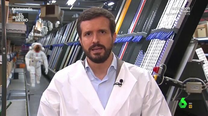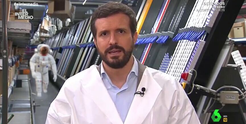 Este montaje de El Intermedio un astronauta avanza hacia Pablo Casado y pega un grito estruendoso mientras el líder de los 'populares' defiende que el PP quiere dar "un impulso a la educación" en la Región de Murcia.