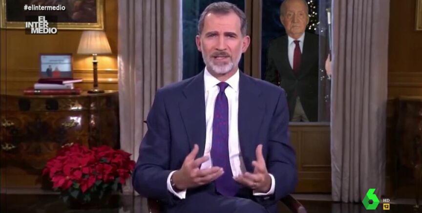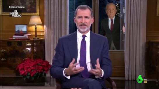 En este montaje de El Intermedio, Juan Carlos I interrumpe el discurso navideño del actual monarca golpeando la ventana del palacio con su bastón para que le abran.