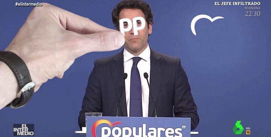 En este montaje de El Intermedio, Teodor García Egea protagoniza un cómico momento cuando, de repente, le trolean con las siglas del PP mientras habla a los medios de comunicación.