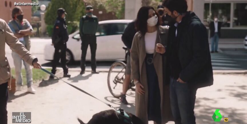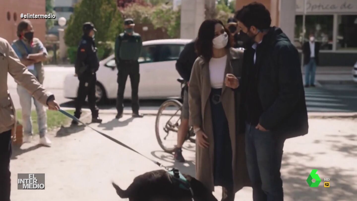 En este montaje de El Intermedio, la presidenta de la Comunidad de Madrid camina junto a Gonzo cuando se cruzan con un perro, que Ayuso se para a acariciar, aunque se confunde de especie.