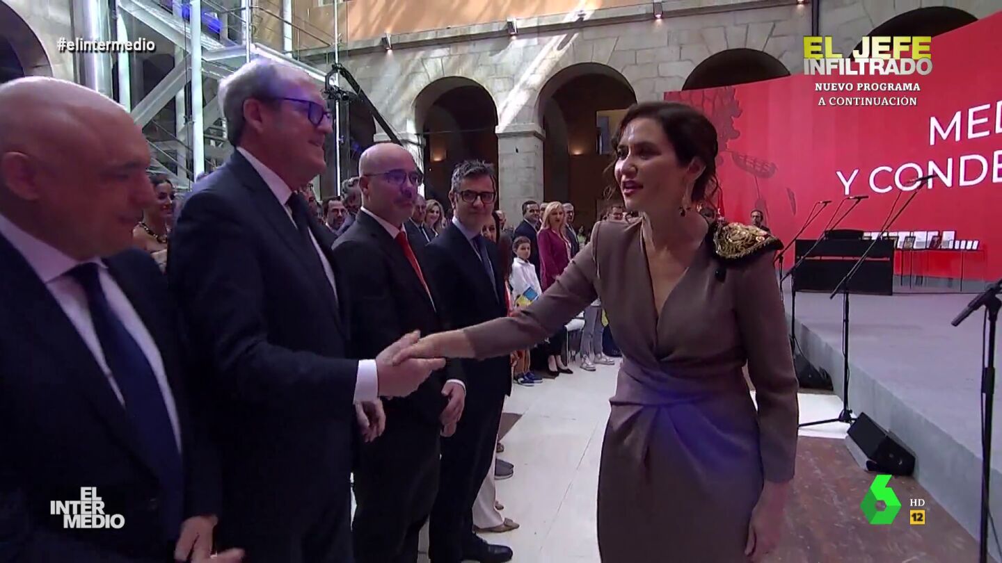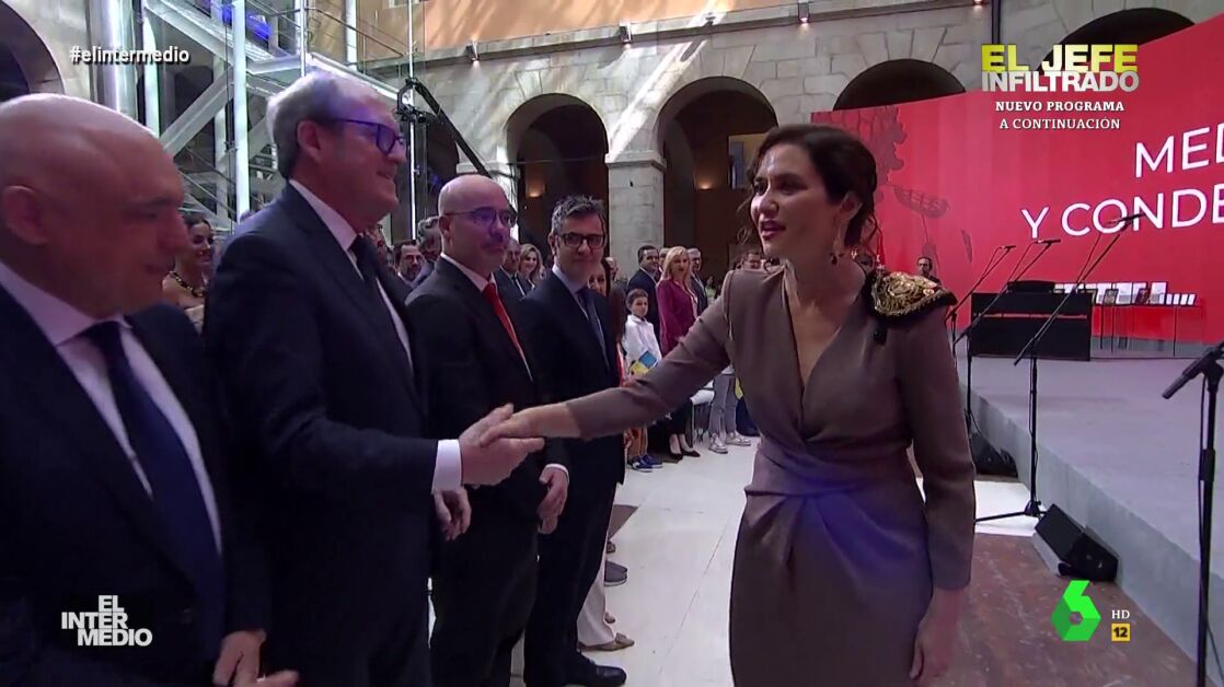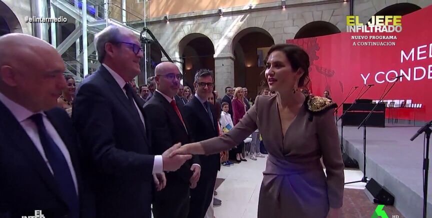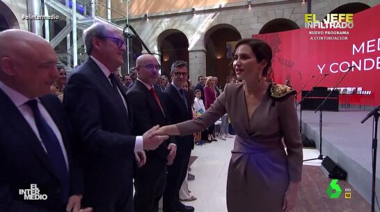 En este montaje de El Intermedio, Isabel Díaz Ayuso saluda a todos los políticos de un acto, tanto hombres como mujeres, diciéndoles "respetable señora". Puedes ver el momento en este vídeo manipulado.