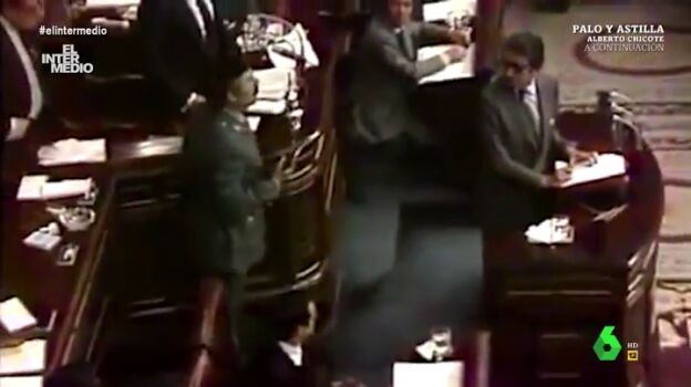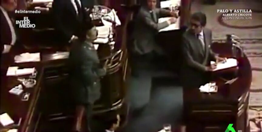 En este montaje de El Intermedio se puede ver el otro momento que no se vio del intento de golpe de estado en el Congreso el 23F: cómo canta Antonio Tejero mientras el resto de políticos 'bailan' en sus bancadas.