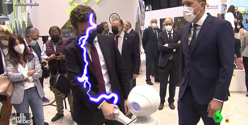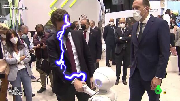 En este montaje de El Intermedio, Pablo Casado, el líder del Partido Popular, saluda a un robot en la feria de turismo celebrada en Ifema y entre ambos se produce una especie de intercambio de electricidad que hace estallar sus cabezas en fuego.