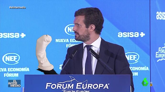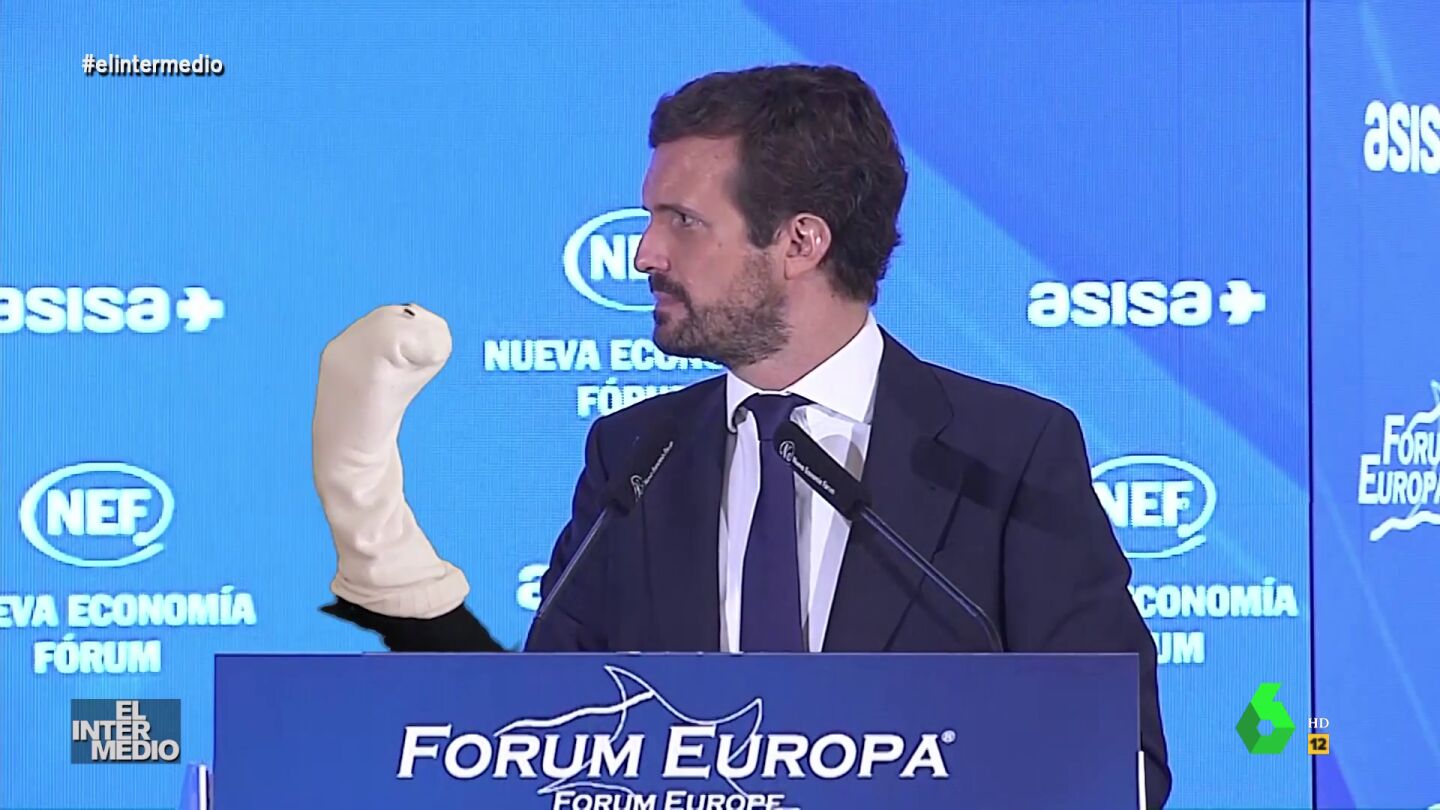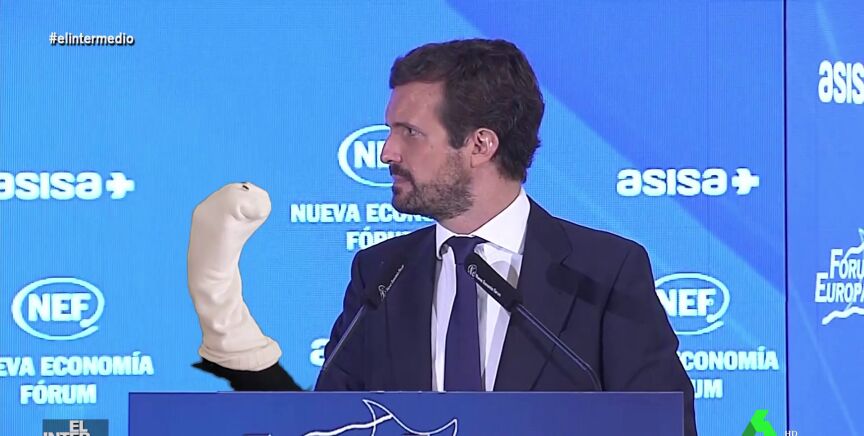 En este montaje de El Intermedio, el líder del PP, Pablo Casado, protagoniza su rueda de prensa más surrealista al sacar un ventrílocuo para hacerle las preguntas.