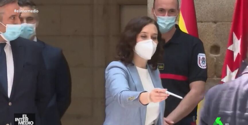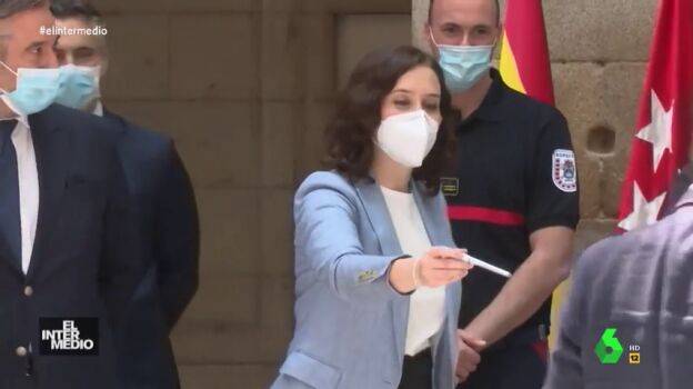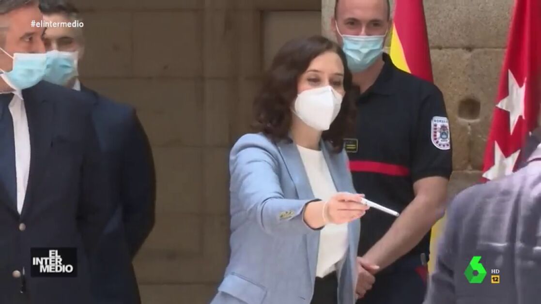En este vídeo manipulado de El Intermedio se puede ver cómo la presidenta de la Comunidad de Madrid, Isabel Díaz Ayuso, intenta hacer amigos en un acto público. La popular se dedica a regalar bolígrafos para que jueguen con ella.