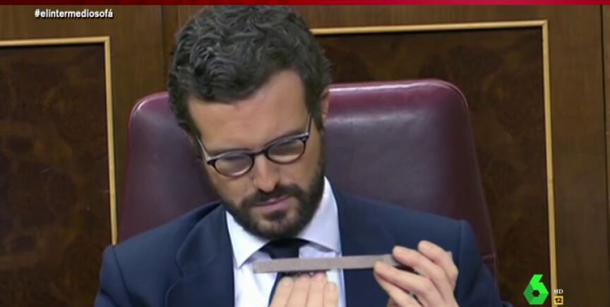 En este montaje, El Intermedio muestra la pillada de los medios de comunicación a Pablo Casado. Y es que el líder del PP es sorprendido limándose las uñas durante una intervención de Pedro Sánchez.