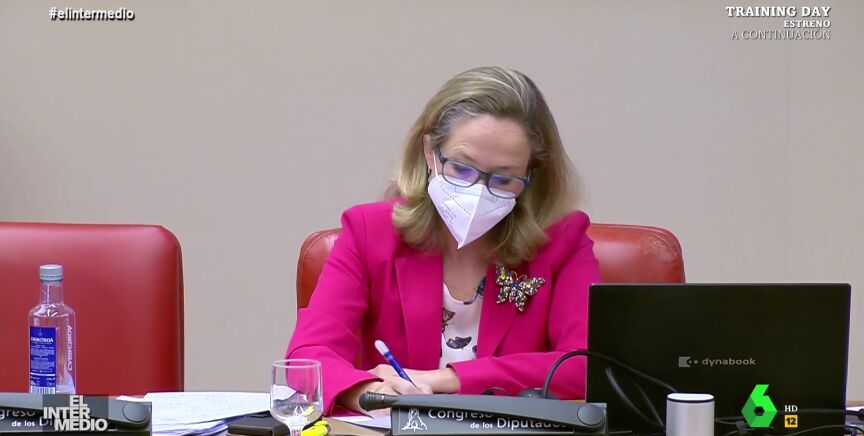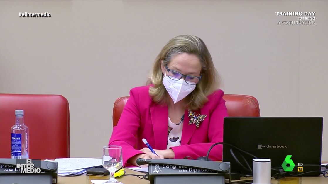 En este montaje de El Intermedio, la vicepresidenta del Gobierno y ministra de Asuntos Económicos y Transformación Digital, Nadia Calviño, sorprende a un diputado con una faceta artística desconocida.