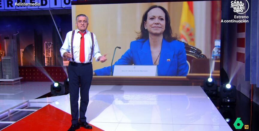 "Algo muy similar ocurre con la líder opositora venezolana María Corina Machado", señala el presentador. "Por alguna extraña razón está convencida de que es presidenta de algún sitio", reflexiona Wyoming, "y la derecha española, por no darle el disgusto, la trata como si lo fuera".