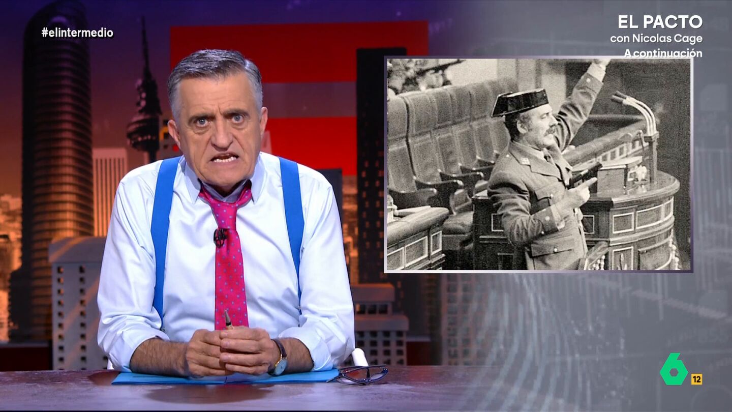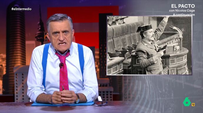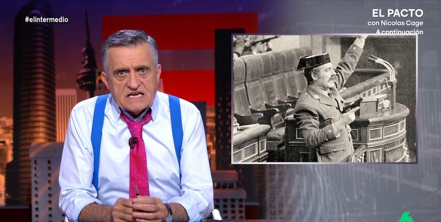 El Gran Wyoming analiza la noticia en el plató de El Intermedio: "Ya es mala suerte, justo en el día en el que Díaz anuncia que no se presenta a las elecciones, boom, se desclasifican los archivos del 23F, se muere el último gran golpista...". "Es muy injusto, a Yolanda Díaz siempre la eclipsa un hombre de derechas", lamenta el presentador, que explica en el vídeo principal de esta noticia: "Hoy ha sido Tejero con su muerte, y el día de la reforma laboral, Casero con su dedo".