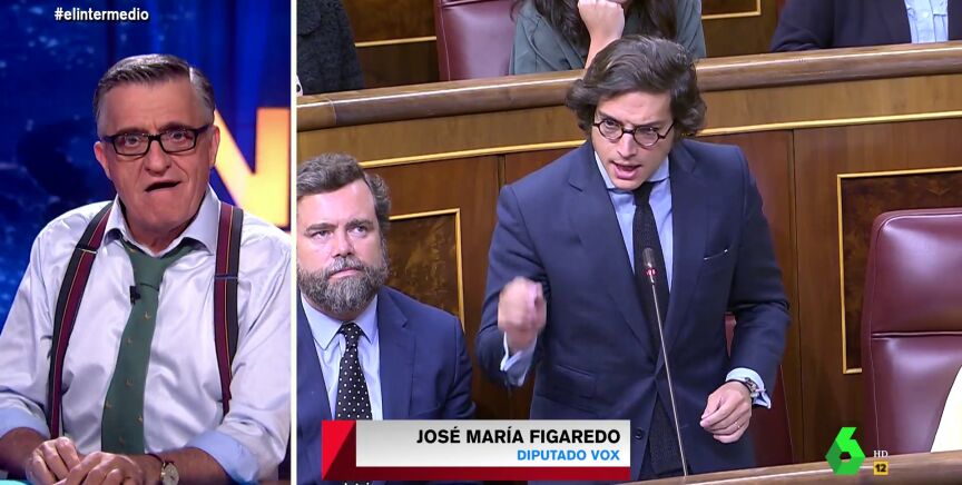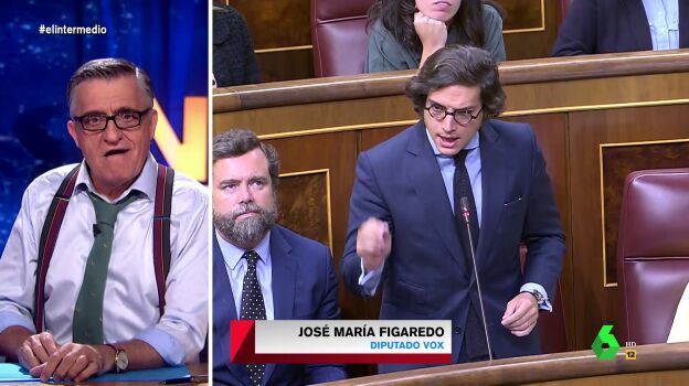 "Os presento al diputado de Vox, José María Figaredo o, como se le conoce, José María Melenas, el azote de los menas", resalta Wyoming, que muestra en el plató de El Intermedio cómo se ha estrenado en el escaño de Olona. Puedes ver su intervención y el análisis de Wyoming en el vídeo principal de esta noticia, en el que Wyoming queda conquistado por el sobrino de Rodrigo Rato: "Solo verle es maravilloso".