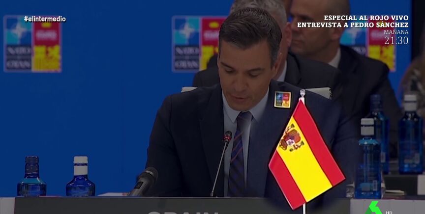 El presidente Pedro Sánchez ha tenido un papel fundamental como anfitrión de la OTAN. Sandra Sabatés y El Gran Wyoming analizan su intervención en el plató de El Intermedio. "Ya es mala suerte, justo el día que el mundo entero nos está mirando, nos ponen al revés la bandera de España", afirma sorprendido El Gran Wyoming, que explica que "si estuviéramos en un conflicto bélico, esto significaría rendición".