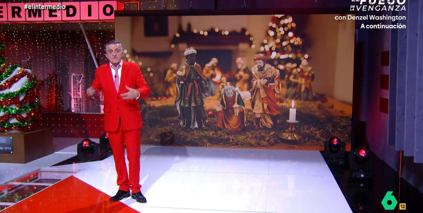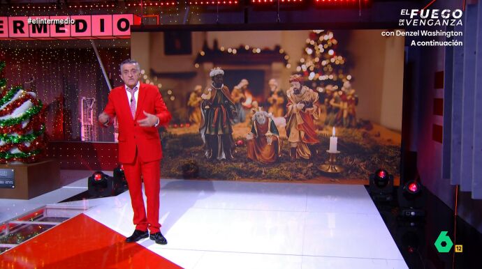 El Gran Wyoming comienza El Intermedio ataviado con traje de color rojo, muy acorde a la época festiva que estamos disfrutando. El presentador de El Intermedio anuncia que "ha llegado la Navidad a El Intermedio", aunque, como advierte, "en vez de la blanca Navidad, este año hemos decidido ser coherentes ideológicamente y celebrar la roja Navidad".