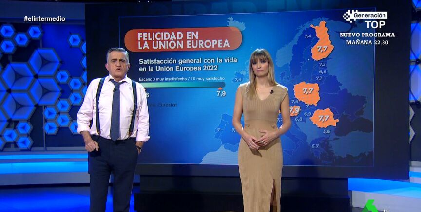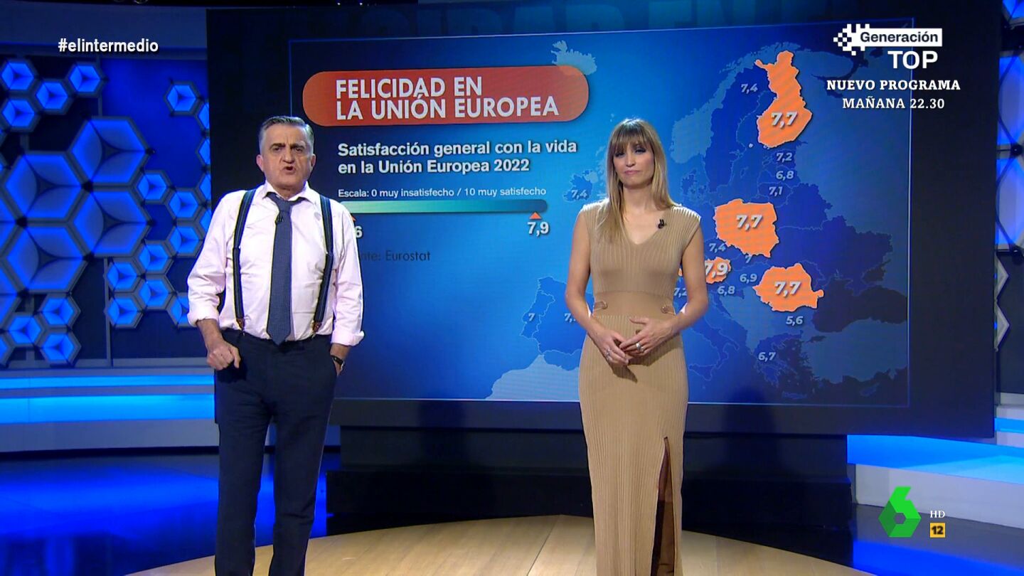 El Gran Wyoming y Sandra Sabatés repasan el informe de Eurostat sobre el índice de felicidad de los ciudadanos europeos, en el que los austriacos se consideran los más felices, mientras que Bulgaria se encuentra en el lado opuesto.