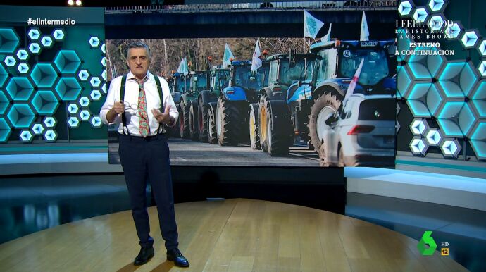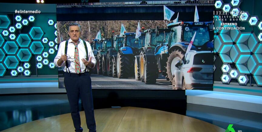 "Francia está 'on fire'", afirma El Gran Wyoming, pues explica que los franceses tienen dos deportes, "sablear a los turistas y liarla parda cada seis meses". El presentador se refiere a los disturbios de estos días que están protagonizando los agricultores, que se quejan de los altos precios y la falta deayudas al campo.