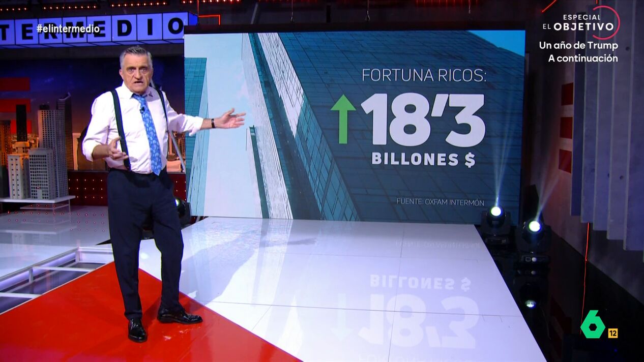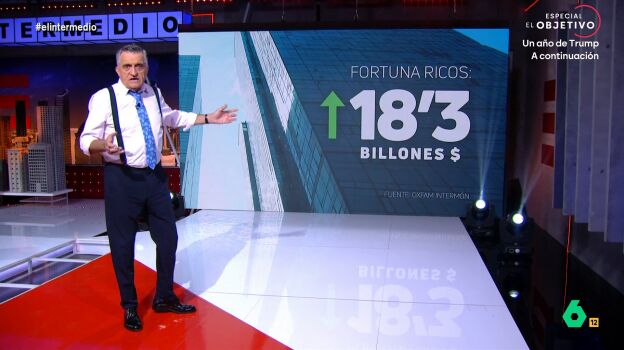 El presentador indica que mientras casi la mitad de la población mundial vive en situación de pobreza, "la fortuna de los multimillonarios alcanzó un máximo histórico: 18,3 billones de dólares".