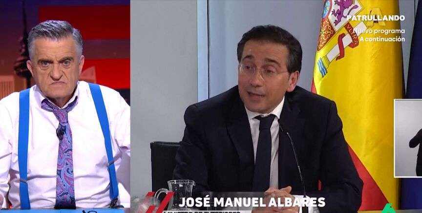 Wyoming considera que Albares es el hombre que más trabaja de España y como ejemplo de ello muestra un fragmento de su intervención en el que relata que ha hablado con sus homólogos en Catar, Baréin, Arabia Saudí, Jordania y Omán y que ha mantenido miles de conversaciones telefónicas. "Y eso porque no os ha contado que en los ratos libres está negociando un tratado de paz entre Andy y Lucas", bromea el 'showman'.