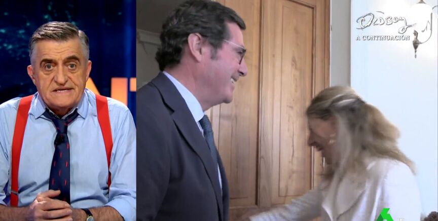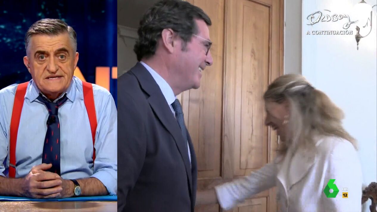 "Lo importante es reducir la jornada laboral y Díaz va a predicar con el ejemplo, por eso se va a ahorrar todas las horas de curro de la negociación con la patronal", ironiza Wyoming en el vídeo sobre estas líneas. El presidente de la CEOE, Antonio Garamendi, asegura que no se oponen a la medida, pero reclaman acuerdos. Sin embargo, el presentador de El Intermedio le recuerda que hace tres meses "consideraba que esta medida se iba a cargar la paz social".