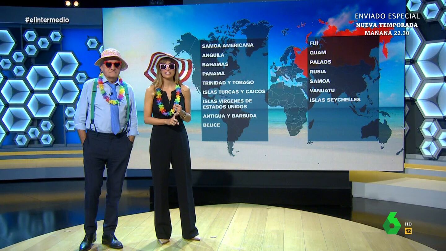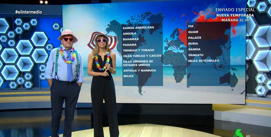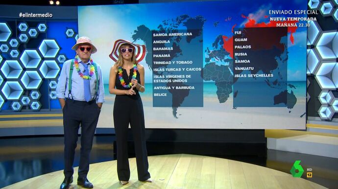 El Gran Wyoming y Sandra Sabatés hacen un análisis de los paraísos fiscales, que la UE recoge en una lista de 16 territorios, en los que se hallaría un 10,6% de nuestro Producto Interior Bruto.