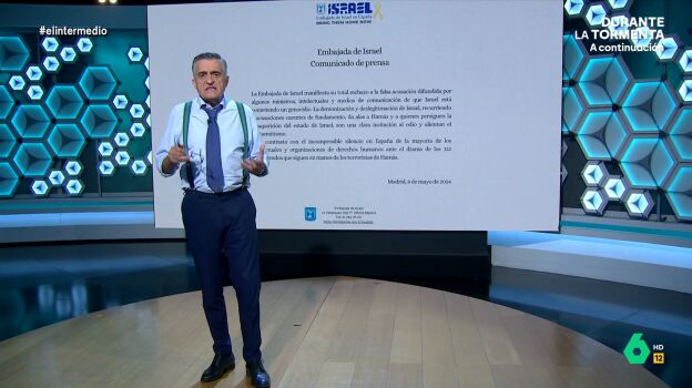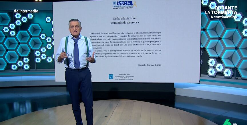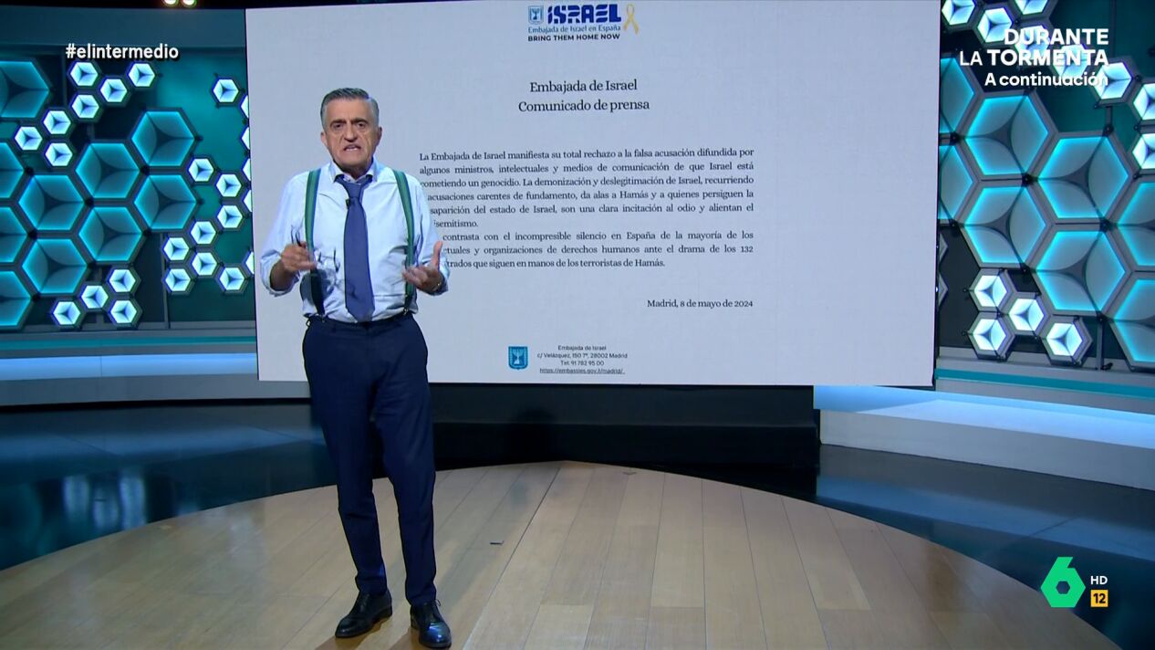Sin embargo, el presentador afirma que "lo que demoniza a Israel no es la carta de un ministro, son sus intolerables actos en la Franja de Gaza". Además, asegura que "condenar esto no es ser antisemita, apoyar al pueblo palestino no es estar del lado de los terroristas" y mantiene que "denunciar este genocidio (...) no es propaganda política es ponerte al lado de las víctimas, en contra de los verdugos, y sentir compasión por un pueblo al que están aniquilando".
