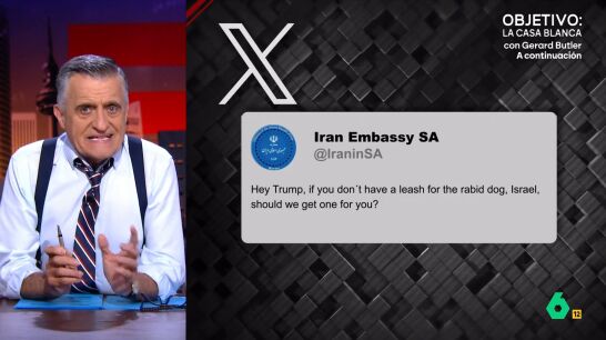El Gran Wyoming no da crédito en el plató de El Intermedio: "¿Cómo es posible que Netanyahu siga asesinando a gente saltándose todas las leyes internacionales y los Derechos Humanos sin que nadie les pare los pies?". "La Comunidad Internacional no puede, el propio Trump no quiere. Así que parece que solo a Irán se le ha ocurrido una solución, como reflejaba una de sus embajadas", afirma el presentador, que muestra en el vídeo el mensaje de dicha embajada al presidente de EEUU en el que han escrito que "si no tiene una correa para el perro rabioso de Israel deberíamos conseguirte una nosotros".