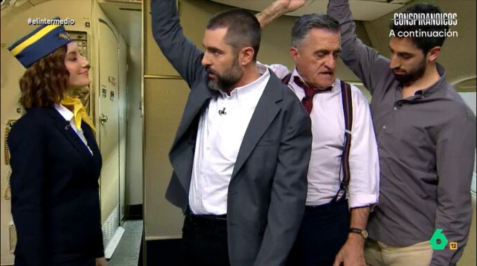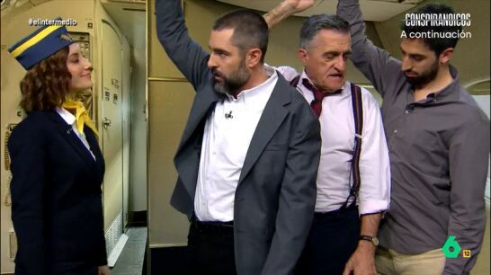 "¿Van a querer algún rasca y gana?", les pregunta la 'auxiliar de vuelo' Cristina Gallego, a lo que Wyoming le responde en el vídeo sobre estas líneas que en la posición que van "me he intentado rascar un hombro y he tardado dos minutos en darme cuenta de que le estaba rascando la papada a este señor".
