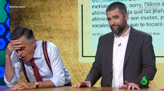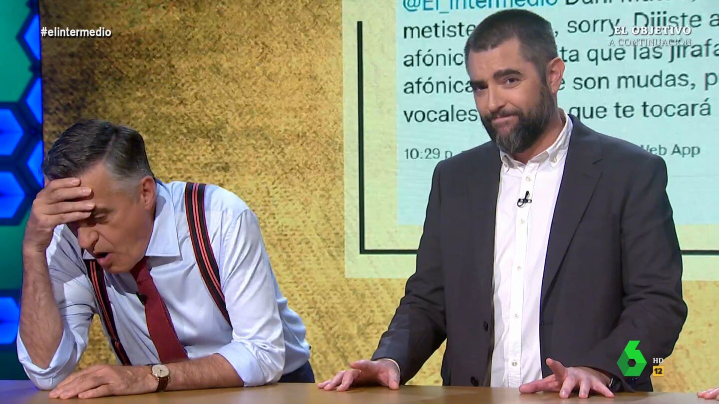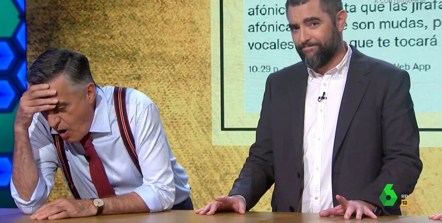 "¡Por dios!", espeta El Gran Wyoming, que se lleva las manos a la cabeza. "¡Pero si eso lo sabe todo el mundo!", le echa en cara, ya que, en el caso de tener cuerdas vocales, más que cuerdas, "tendrían sogas". "Ahora mismo me gustaría ser mudo como una jirafa para no poder dar explicaciones y no estar aquí", se lamenta Dani Mateo, que reconoce no tener ni idea sobre estos animales.