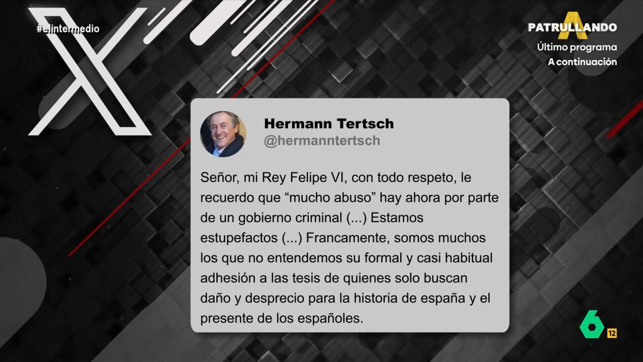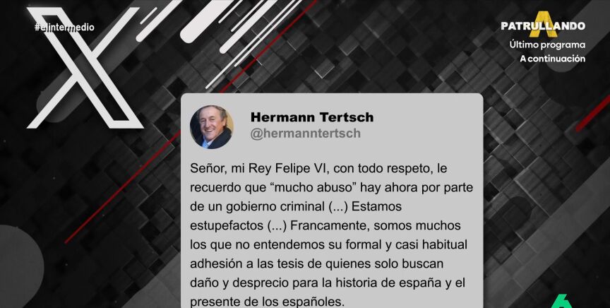 Pero Millán no es la única voz crítica con el rey dentro de Vox, el eurodiputado Hermann Tertsch ha publicado un mensaje en su cuenta de X en el que ha mandado un mensaje al rey Felipe. "Señor, con todo el respeto, le recuerdo que mucho abuso hay por parte ahora de un Gobierno criminal", ha afirmado Hermann Tertsch, que ha asegurado que están "estupefactos": "Somos muchos los que no entendemos su formal y casi habitual adhesión a las tesis de los que solo buscan daño y desprecio para la historia de España y el presente de los españoles".