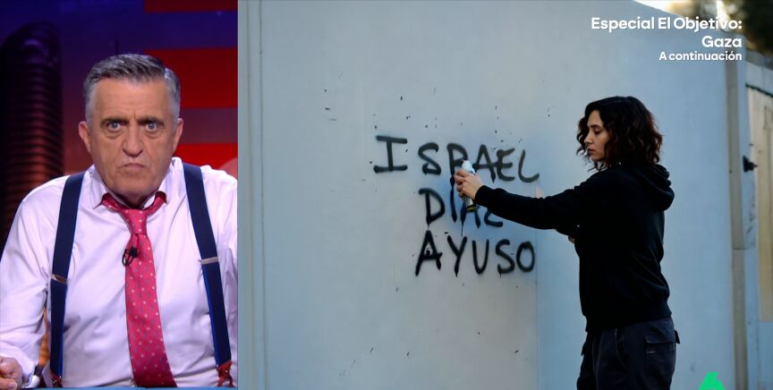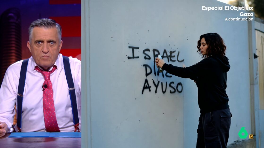 El Gran Wyoming no da crédito y responde desde el plató de El Intermedio: "Madre mía Ayuso, cada vez está más a tope con Netanyahu". Además, el presentador enseña en el vídeo una pintada en un muro en la que se puede leer "Israel Díaz Ayuso" y reflexiona: "Empiezo a sospechar quién ha podido ser la artista".