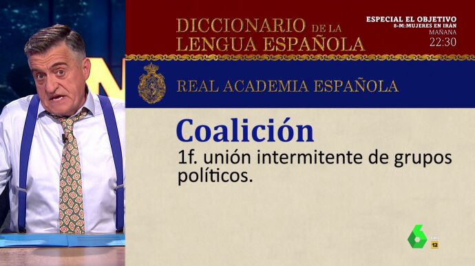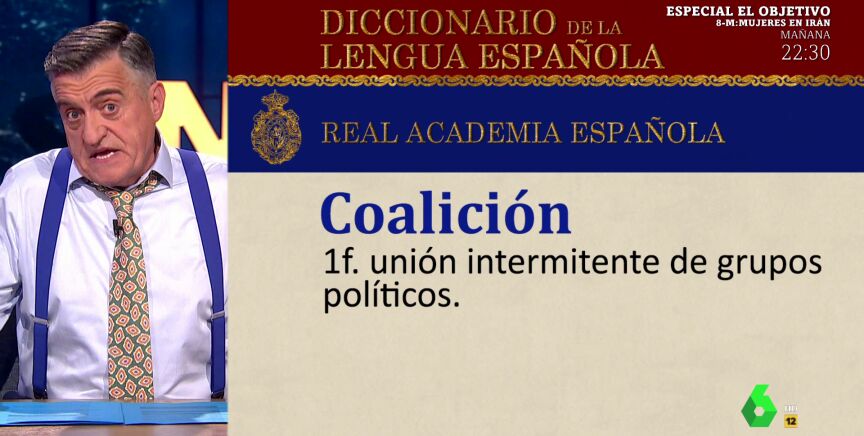 Ante este enfrentamiento, Wyoming pide a la RAE que cambie la definición de 'coalición' en el diccionario por "unión intermitente de grupos políticos": "Ya no son socios, como mucho follamigos", ironiza el presentador de El Intermedio en el vídeo sobre estas líneas.