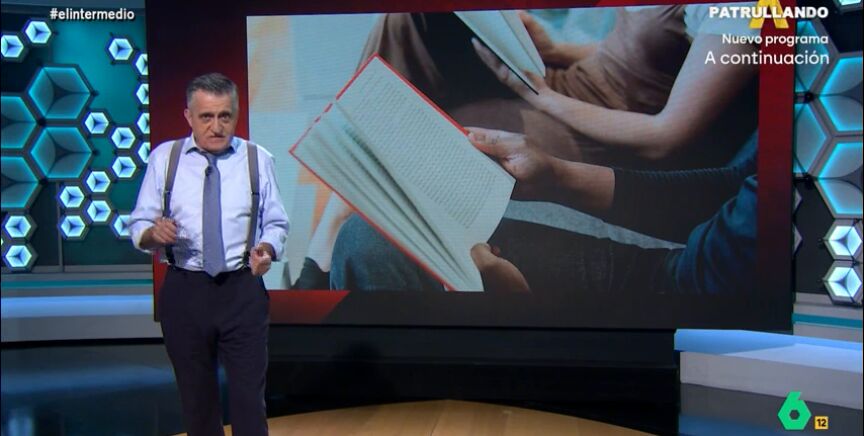 "Es un auténtico récord", apunta, "pensad que venimos de un país en el que hace no tanto solo había un par de libros en la mayoría de las casas: las guías telefónicas y, como mucho, un librillo de papel de fumar". El presentador indica que un 35% de españoles afirman no leer nunca o casi nunca, "y, de ellos, la gran mayoría, un 44%, afirman que no leen 'por falta de tiempo'".