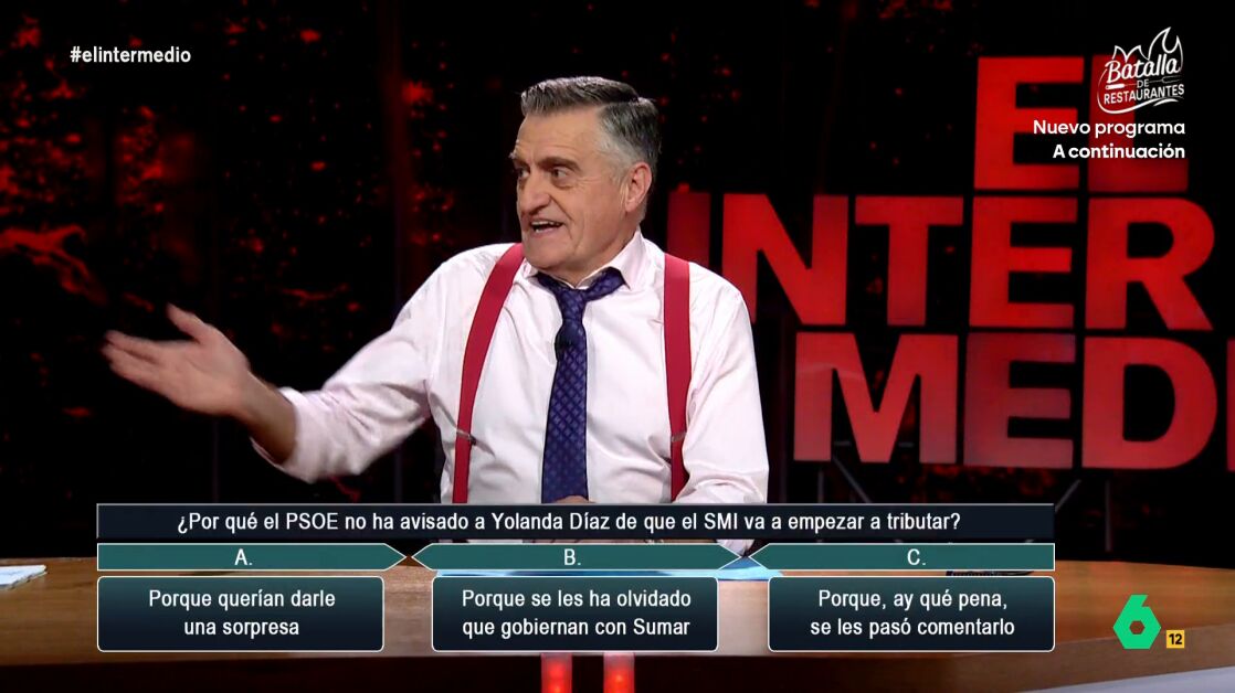 Yolanda Díaz aseguraba que se había enterado de esta decisión por la prensa, por lo que Wyoming monta un concurso en torno al motivo de que esto era así: "Porque querían darle una sorpresa; porque se les ha olvidado que gobiernan con Sumar; porque, ay qué pena, se les pasó comentarlo", plantea como opciones.
