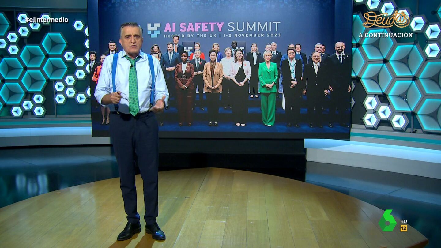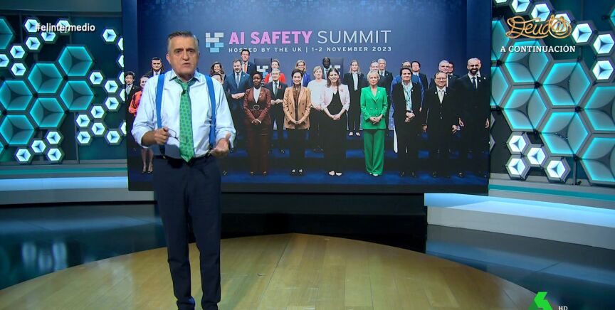 El presentador de El Intermedio explica que 28 países acaban de firmar el primer acuerdo mundial para actuar de forma conjunta ante los peligros de la IA. EEUU, China y la Unión Europea, entre otros, se han unido antes de que esta produzca daños graves e incluso catastróficos para la humanidad, como ciberataques a gran escala, fraude masivo o armas biológicas.