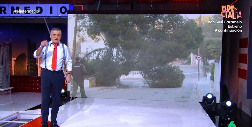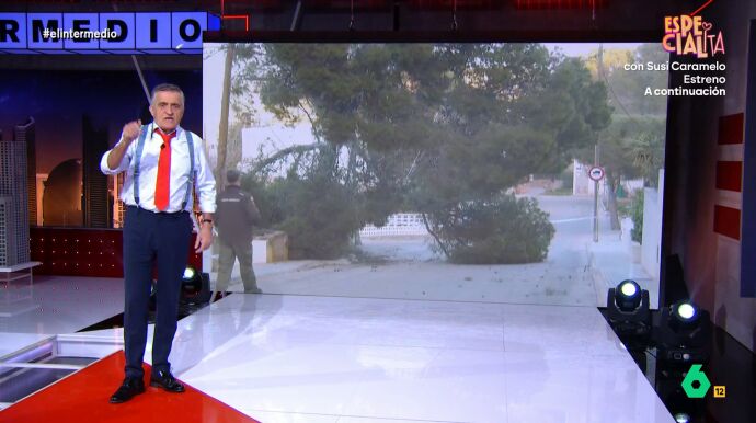 Wyoming arranca El Intermedio con la "gomina extrafuerte" por el temporal de viento en España. Un tren de borrascas sobre el que el presentador afirma que "ya es mala suerte que sea el único tren de España que llega sin problemas".