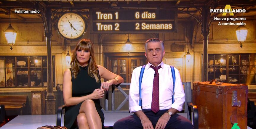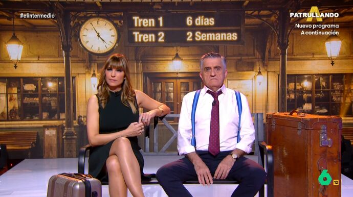 Wyoming y Sandra Sabatés analizan desde una estación de tren la comparecencia de Óscar Puente en la comisión del Congreso que investiga los accidentes de Adamuz y Gelida. Sin embargo, su tren "lleva tanto tiempo detenido en la vía que el vagón cafetería ya está poniendo una terraza".