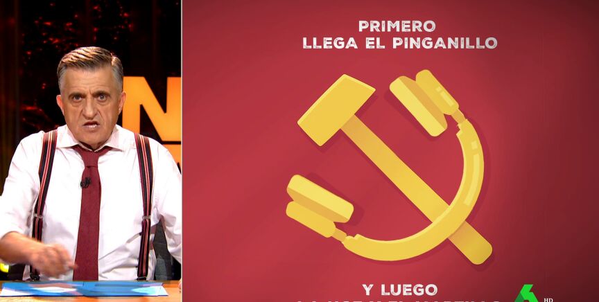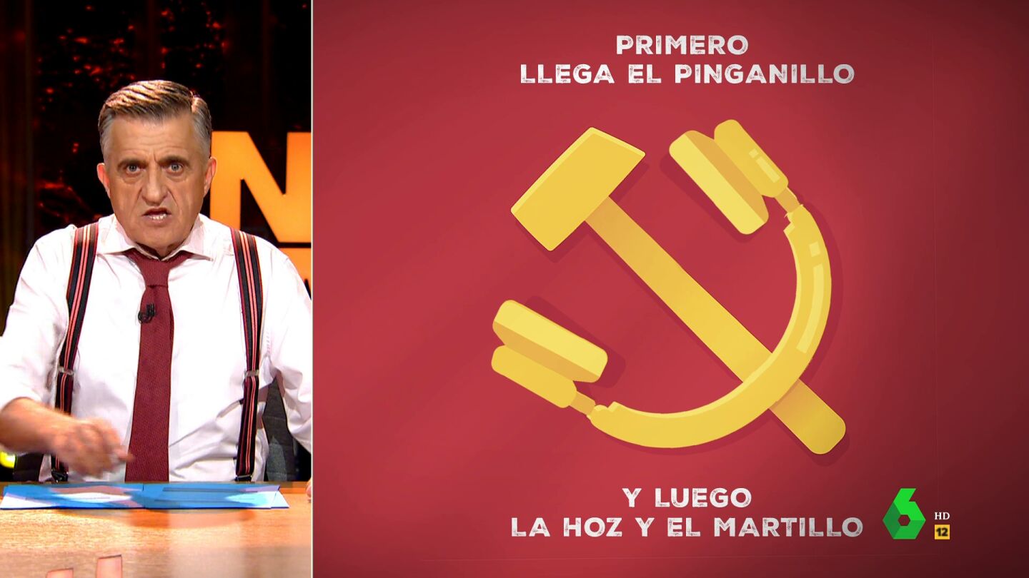 Así, el presentador ha ironizado que los pinganillos "son herramientas adoctrinadoras de la izquierda totalitaria 'bolcheviquebilduetarra'". Además, a raíz de la aversión de PP y Vox a los pinganillos, ha compuesto un refrán que dice que "primero llega el pinganillo y luego la hoz y el martillo".