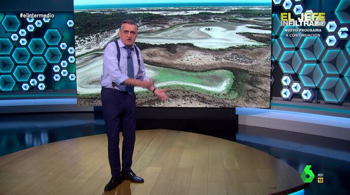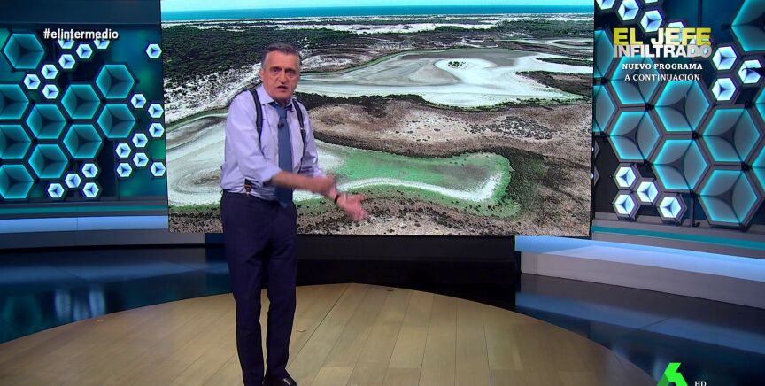 "Tenemos un problema grave", afirma el presentador de El Intermedio, y señala que lo que hace el español ante este problema es "tirarse los trastos a la cabeza". "El agua ha llegado a la campaña electoral", comenta, pues el presidente de la Junta de Andalucía, Juanma Moreno, critica la inacción del Gobierno ante la situación de sequía y le urge a plantear una estrategia. Wyoming cree que nadie sabe lo que hay que hacer, pero indica que hay "alguna evidencia" de lo que no hay que hacer: "En una situación de sequía severa, no se deberían regularizar los regadíos ilegales que vacían las marismas de Doñana".