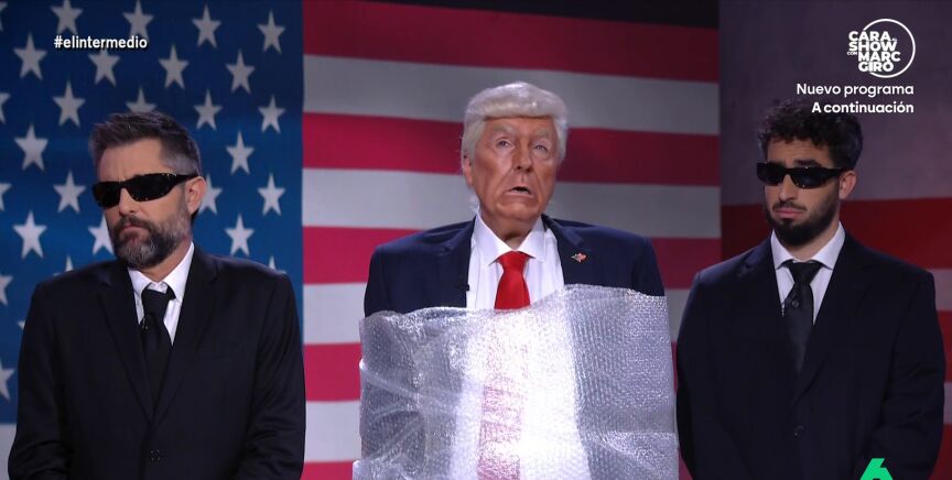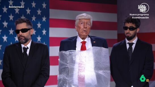 Este consiste en envolverlo en plástico de burbujas. "Es una butifarra yanqui", le dice el Gran Wyoming al verle embutido en su protección. "Es el nuevo protocolo de seguridad", responde 'Trump', "un súper escudo antibalas con el que nadie podrá matarme".