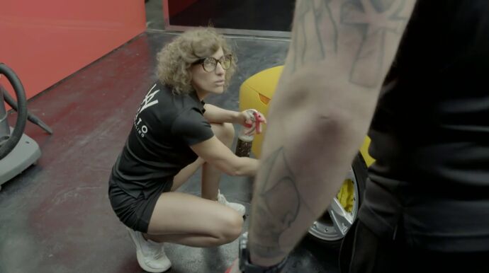 "Producto y trapo (...) , pulverizas, limpias y a la siguiente llanta", le indica Antón a 'Paca', su falsa 'aprendiz', sin saber que en realidad se trata de su jefa infiltrada. "¿Las cuatro llantas las tengo que lavar yo? ¿Tú no vas a limpiar ninguna?", se queja ella. "Claro, tú eres la aprendiz", responde.