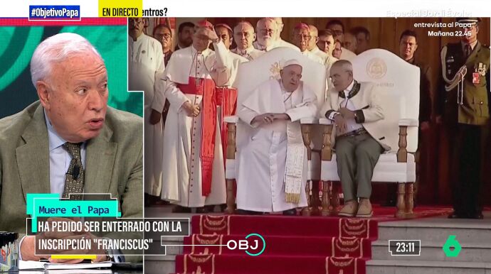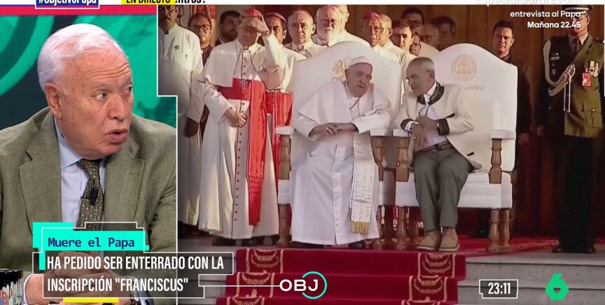 El exministro español de Asuntos Exteriores, José Manuel García-Margallo, ha comparado este lunes en El Objetivo de Ana Pastor con sus predecesores Juan Pablo II y Benedicto XVI, pues ha conocido a los tres. Mientras que a los dos primeros lo hizo como diputado del Partido Popular Europeo (PPE), con Francisco coincidió ya durante su etapa al frente de la cartera diplomática de Moncloa.