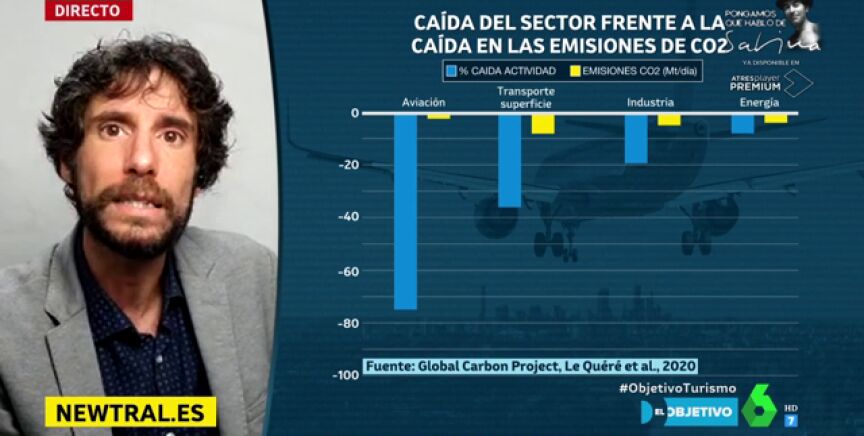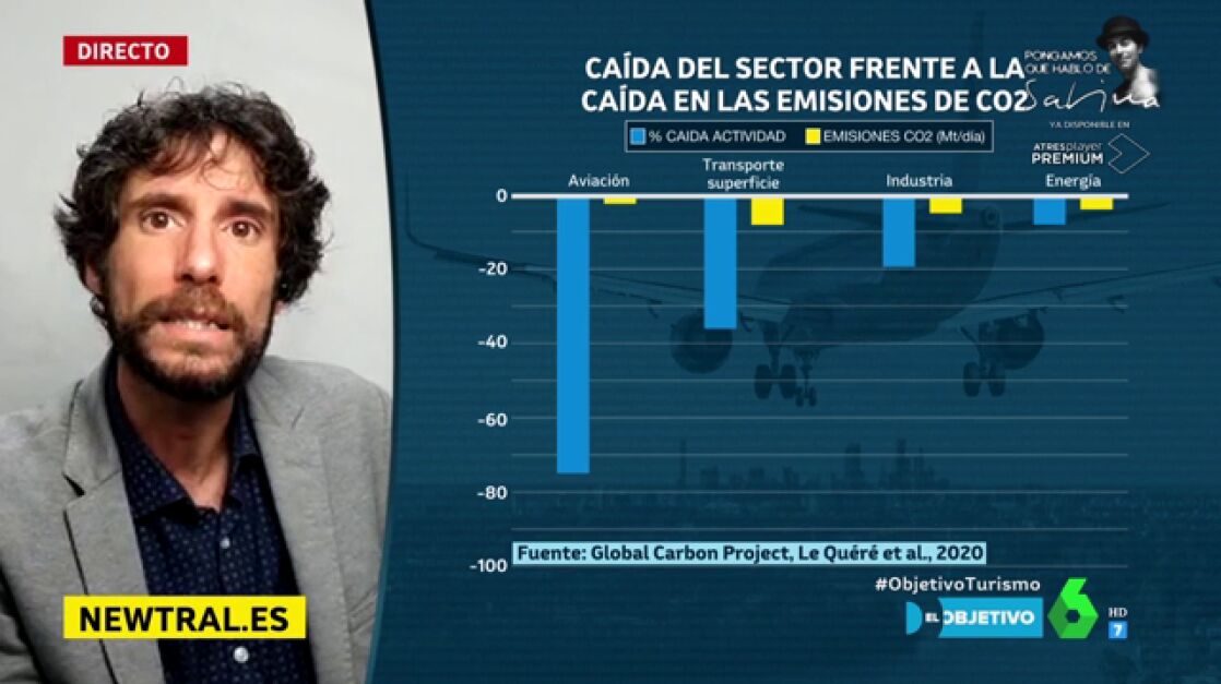 Mario Viciosa explica en El Objetivo cómo el parón de los medios de transporte, como los aviones, ha contribuido al descenso brusco de la emisión de CO2, una circunstancia que ha beneficiado al medio ambiente.