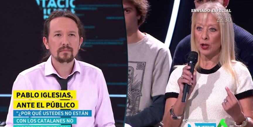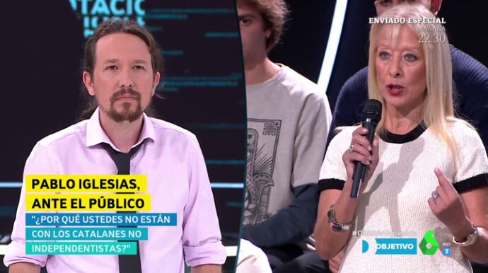 Victoria Muñiz, una ciudadana de Tarragona, ha espetado a Pablo Iglesias en El Objetivo su postura sobre Cataluña, ya que a su juicio, "en caso de votar", tendrán que hacerlo "todos los españoles".