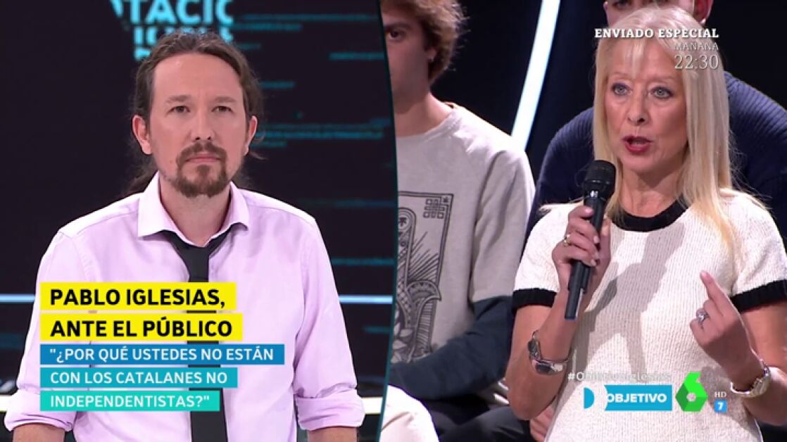 Victoria Muñiz, una ciudadana de Tarragona, ha reprochado a Pablo Iglesias en El Objetivo que desde su formación "apoyen" a los políticos "corruptos" y que "no representan" a los catalanes: "Tienen una responsabilidad, y no la están cumpliendo. No lo están haciendo bien, están perdiendo cada vez más porque no representan a una mayoría".