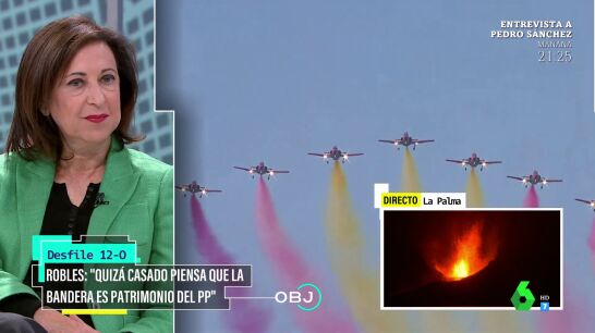 El vuelo de la Patrulla Águila en el desfile militar dejó una imagen muy comentada: uno de los aviones aparentemente expulsó humo morado, en vez de rojo... formando una bandera republicana. La ministra de Defensa ofrece una explicación en El Objetivo.