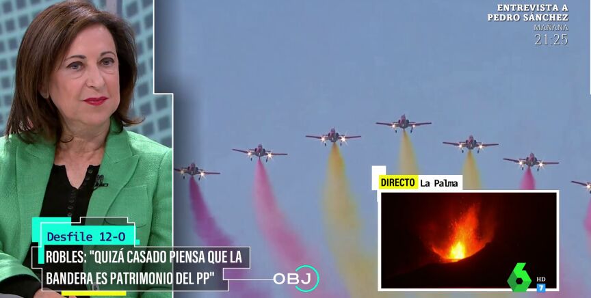 Ana Pastor ha preguntado a Margarita Robles al respecto en El Objetivo, donde la ministra de Defensa ha ofrecido su explicación a ese humo morado y ha defendido que no había "ningún mensaje" oculto. Puedes ver su explicación en el vídeo que ilustra estas líneas.