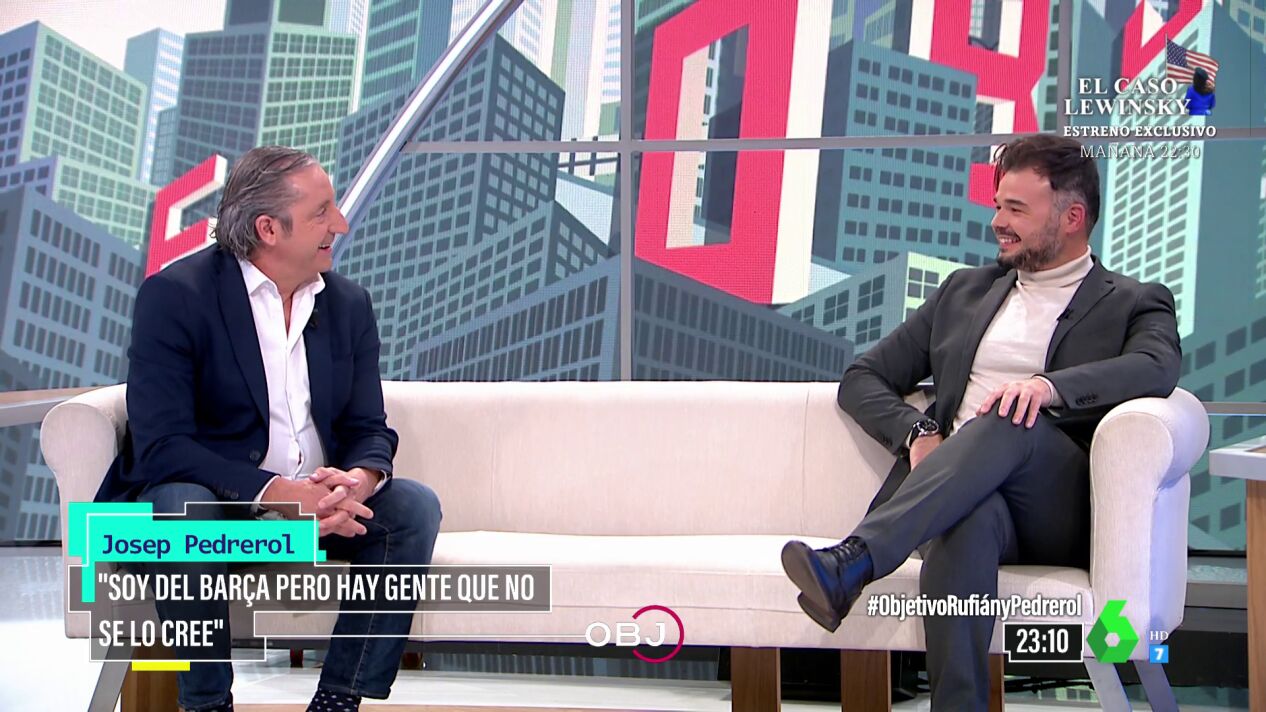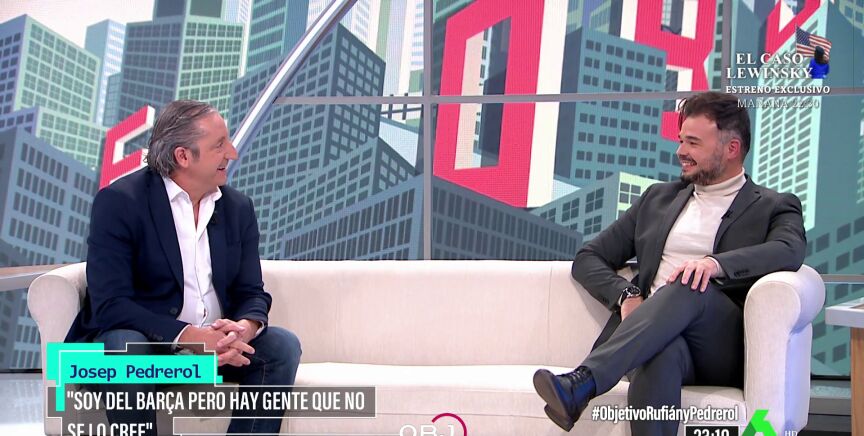 El político Gabriel Rufián y el periodista Josep Pedrerol se han conocido en el plató de El Objetivo y han protagonizado un divertido momento. Ambos han bromeado sobre sus equipos de fútbol, uno es del Barça y otro del Espanyol, y sobre la política. "Lo fácil es ser culé", le ha dicho Rufián a Pedrerol, a lo que el presentador ha respondido: "Rufián, que es del Espanyol y político catalán, podría ayudar más al Espanyol en Cataluña, que colabora y lo demuestre. Lo fácil es decir que eres del Espanyol y no ayudar al Espanyol".