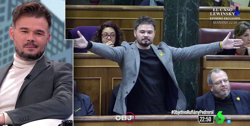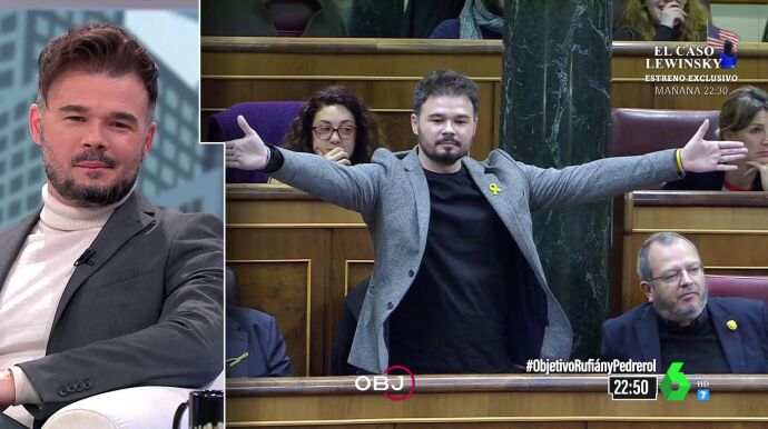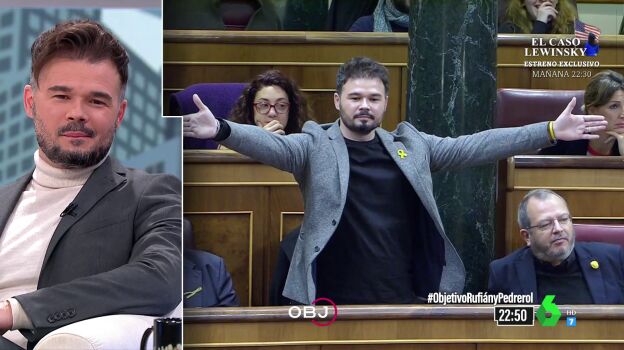 ¿Ha cambiado Gabriel Rufián su perfil político? ¿Ha dejado atrás el debate bronco? En El Objetivo, Ana Pastor ha repasado con el diputado y portavoz de Esquerra Republicana de Catalunya (ERC) los diversos sucesos de tensión que ha vivido -y a veces provocado- el dirigente independentista en el Congreso de los Diputados, muchos de los cuales han acabado en conocidas 'performances' o duros encontronazos con otros dirigentes.