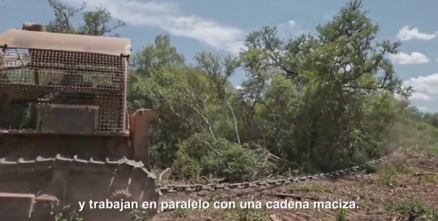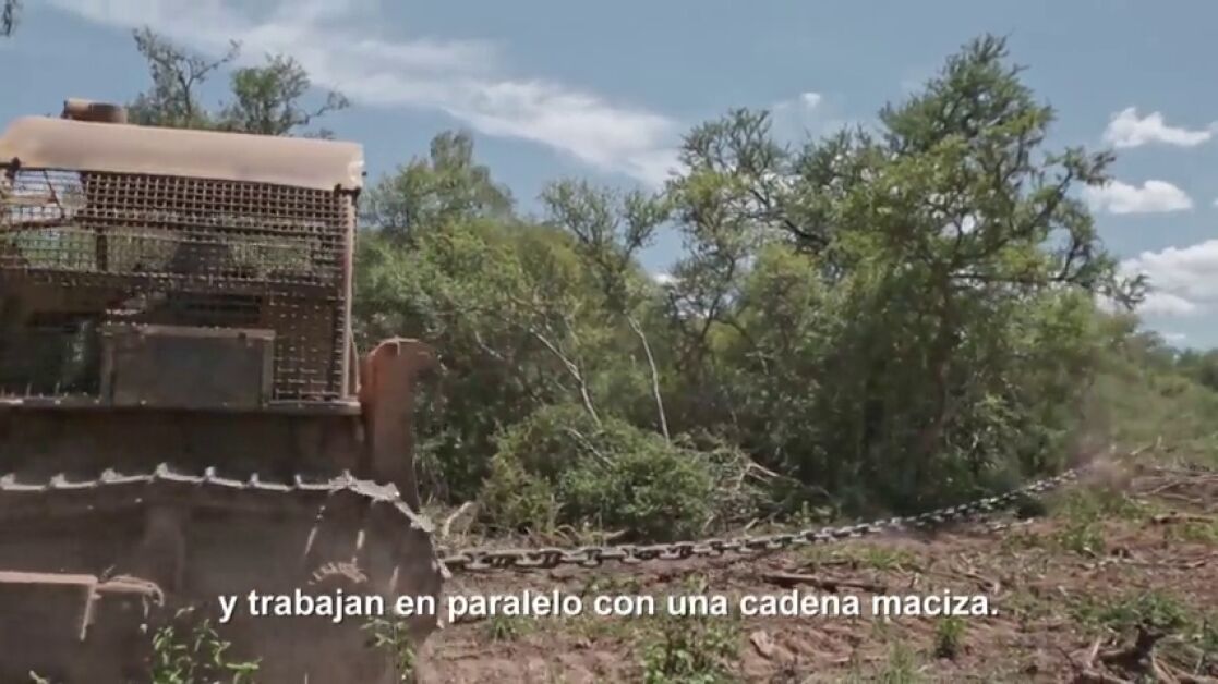 "Grandes tractores con palas arrastran cadenas que van demoliendo los árboles, que una vez arrancados, se apilan y se reducen a cenizas. Ese terreno sin vegetación se emplea después para la siembra de soja".